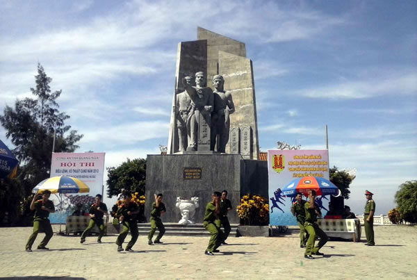 | CBCS CAH Lý Sơn biểu diễn võ thuật trước tượng đài Hoàng Sa Bắc Hải. |