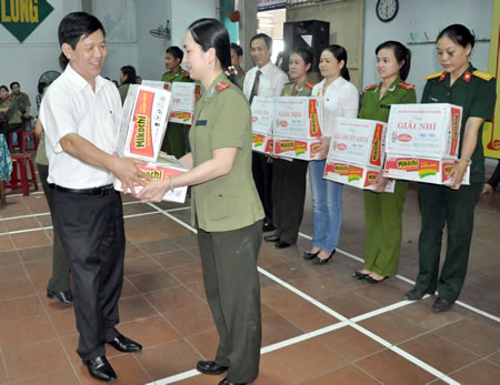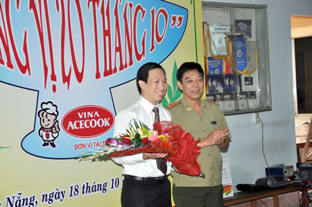 Đại tá Nguyễn Viết Lợi - Phó Giám đốc CATP tặng hoa đơn vị tài trợ.