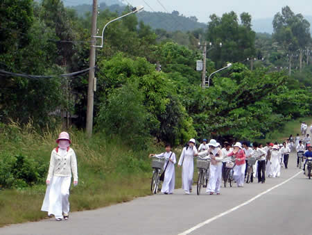Học sinh ở đảo đi học trên con đường ngày xưa toàn đồn bốt, dây kẽm gai. |