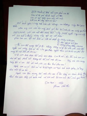 Đã đến giờ nghe Hội đồng Thi hành án công bố quyết định của Chủ tịch nước bác đơn xin ân xá của tử tội. Hội ngồi lặng lẽ... Và rồi, y được nói lời sau cùng và viết thư về cho gia đình, người thân. Giấy bút đã được chuẩn bị sẵn, tay Hội run rẩy và từng nét chữ nguệch ngoạc như là lời trăn trối, lời hối lỗi muộn màng: “... Hôm nay con viết lại mấy chữ gửi lại bố, anh, chị, em cùng gia đình. 28-7-2010, với con một dấu chấm hết... Con đi rồi, tội lỗi của con coi như đã trả, phiền nỗi thương tới bố, các anh chị em sống mà còn mang tiếng đời vì con. Bố và anh chị, em tha thứ cho con!... Ngàn vạn lần mong bố, anh, chị, em ở lại sống vui khỏe, hãy tha thứ cho con... Hãy cứ trách móc và con mãi là con của bố, của gia đình! Con trai: Phạm Văn Hội”.
