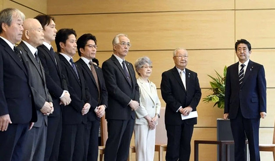 Thủ tướng Abe (phải) gặp nhóm đại diện gia đình của những người Nhật bị Triều Tiên bắt cóc. Ảnh: Kyodo |
