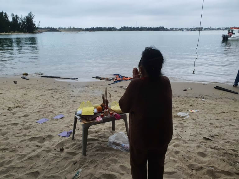 Một người dân lập bàn thờ trên bờ biển, cầu mong may mắn đến với các nạn nhân trong khi các cơ quan chức năng đang triển khai hoạt động tìm kiếm. |