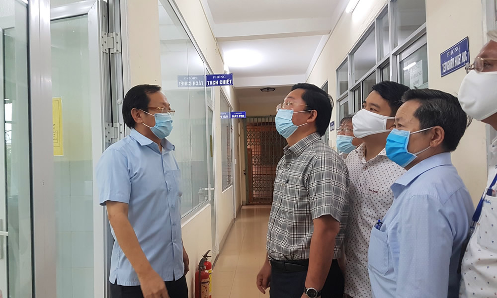 Ông Nguyễn Văn Hai - Giám đốc Sở Y tế tỉnh Quảng Nam (bìa trái) báo cáo với đoàn công tác của UBND tỉnh về hệ thống máy xét nghiệm Realtime PCR. |