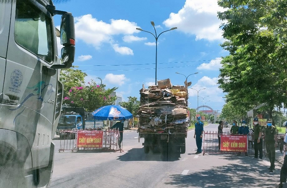Lực lượng chức năng làm nhiệm vụ tại chốt kiểm soát dịch trên tuyến ĐT609 qua địa phận huyện Đại Lộc. |