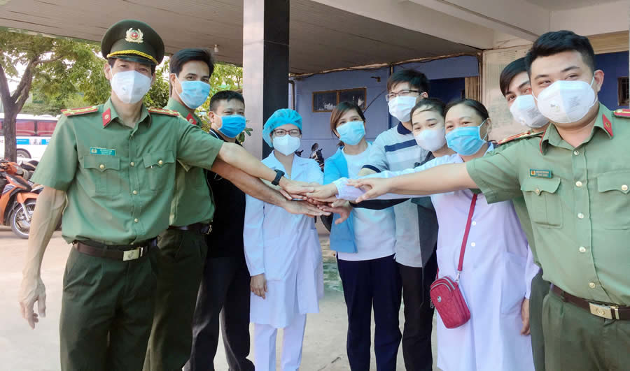 Đại tá Võ Văn Dương - Phó Giám đốc Công an tỉnh Quảng Ngãi chụp ảnh lưu niệm với đội ngũ y, bác sĩ và các cán bộ, chiến sĩ Công an trong đoàn trước khi lên dường. |