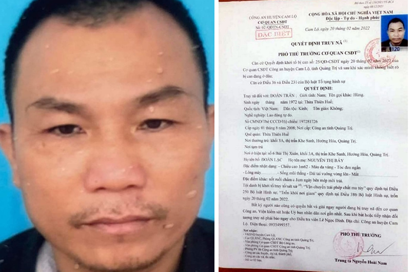 Ngày 22 – 2 – 2022, tin từ CAH Cam Lộ cho biết đã ra các quyết định khởi tố bị can đối với Đoàn Trân (1972, trú khối 3A, TT Khe Sanh, H.Hướng Hóa) và Nguyễn Văn Tiềm (1992, trú An Nha, Gio An,H.Gio Linh) về hành vi “Trốn khỏi nơi giam”. Đồng thời, CAH Cam Lộ cũng đã quyết định truy nã đặc biệt đối với 2 bị can này. Trước đó, Trân và Tiềm là bị can trong hai vụ án ma túy khác nhau và bị tạm giam tại nhà tạm giữ CAH Cam Lộ. Tiềm có hành vi phạm tội Tàng trữ trái phép chất ma túy còn Trân bị khởi tố về tội Vận chuyển trái phép chất ma túy. Vào rạng sáng ngày 20-2-2022, cả hai đã khoét tường buồng giam, bỏ trốn.
