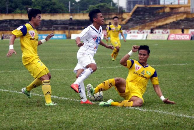 | Pha bóng mà Quế Ngọc Hải đã phi thẳng hai chân vào Anh Khoa (giữa) khiến tiền vệ của SHB Đà Nẵng có nguy cơ đứt dây chằng gối. Ảnh: T.T |