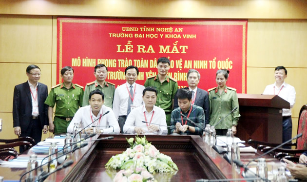 Nghệ An- Trường Đại học Y Khoa Vinh phối hợp Phòng An ninh chính trị nội bộ CA tỉnh Nghệ An vừa tổ chức lễ ra mắt mô hình tự quản về ANTT "Trường bình yên - Viện bình an".