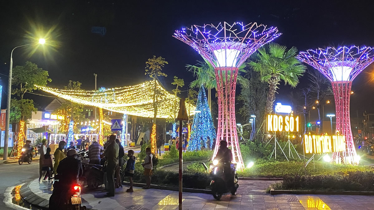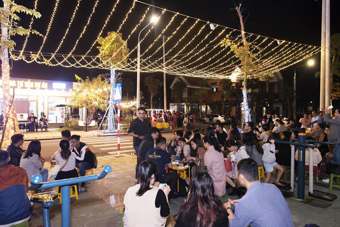 Tuyến phố ẩm thực Điện Thắng tại KĐT Epic Town nhộn nhịp và rực rỡ về đêm. |