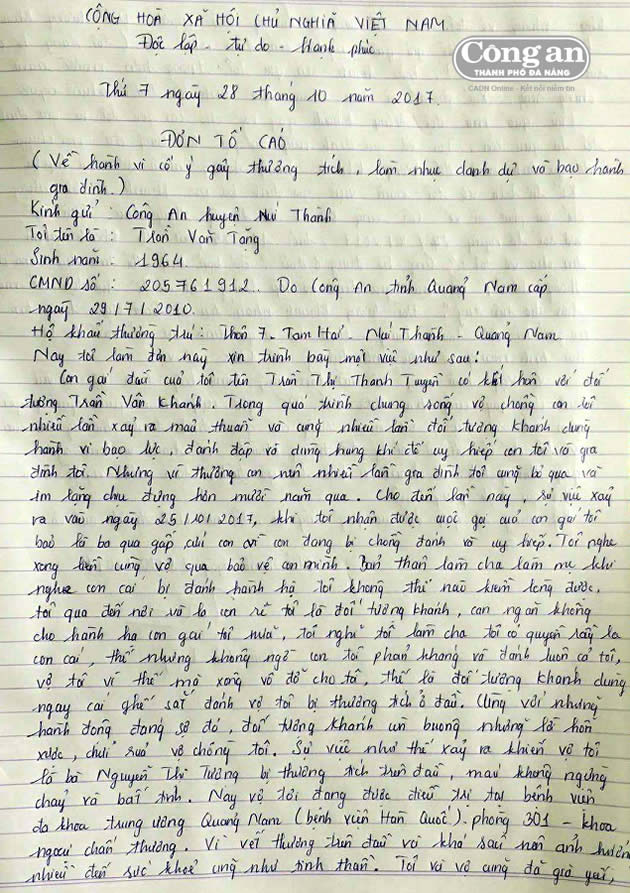 Theo đơn trình bày của ông Trần Văn Tặng, tối 25-10, ông nhận được điện thoại của con gái là Trần Thị Thanh Tuyền, cầu cứu: Ba qua gấp cứu con, con đang bị chồng đánh và uy hiếp. “Dù đêm tối, đường sá cách trở nhưng khi nghe con gái gọi nói vậy, tôi cùng vợ liền sang để có biện pháp bảo vệ con mình. Khi đến nơi, là cha mẹ, tôi la mắng để con rể hiểu ra sự việc mà thay đổi. Thế nhưng không những không nghe mà Khánh còn phản kháng và đánh luôn tôi. Vợ tôi thấy thế vào đỡ cho tôi cũng bị Khánh dùng chiếc ghế sắt đánh vào đầu, máu không ngừng chảy, bất tỉnh và được đưa đi cấp cứu tại Bệnh viện Đa khoa T.Ư Quảng Nam.