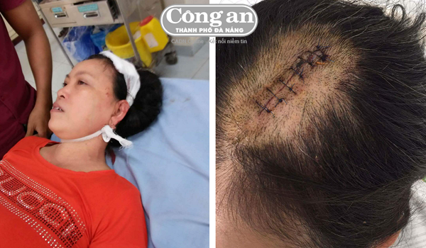 | Bà Nguyễn Thị Tượng tại bệnh viện và vết thương trên đầu. |