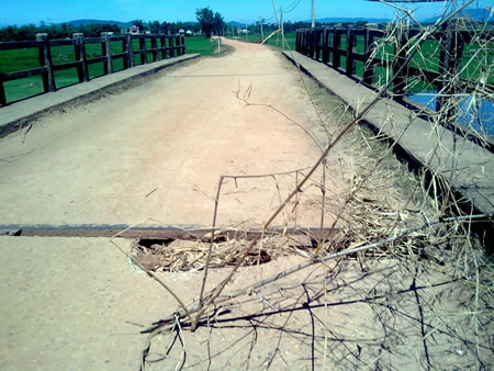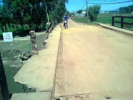 Chạy xe trên con đường đất đầy bụi mù về xã Bình An, vừa đến đầu cầu Bình An (trước đây gọi là cầu Tổng, thuộc xóm Gò Tre, thôn An Thành 2, xã Bình An) NXD không khỏi giật mình khi thấy một đoạn khá dài thành cầu bị bể, sụp xuống sông còn mặt cầu thì nham nhở do bê-tông bị bong tróc. Dừng lại chụp vài pô ảnh, chợt nghĩ hiện trạng cây cầu hoàn toàn trái ngược với tên nó: cầu Bình An chẳng an toàn tí nào. Đi tiếp đến xóm Nam Yên, thôn Thái Đông (xã Bình An), NXD gặp cây cầu Hai (trước đây gọi là cầu Còn) cũng nguy hiểm cho người và phương tiện không kém bởi một đầu nhịp cầu (đoạn nối giữa 2 nhịp) bị sụp xuống, mặt đường bị bể tạo ra một khoảng trống lớn nếu sơ sẩy là bị "nuốt" như chơi.