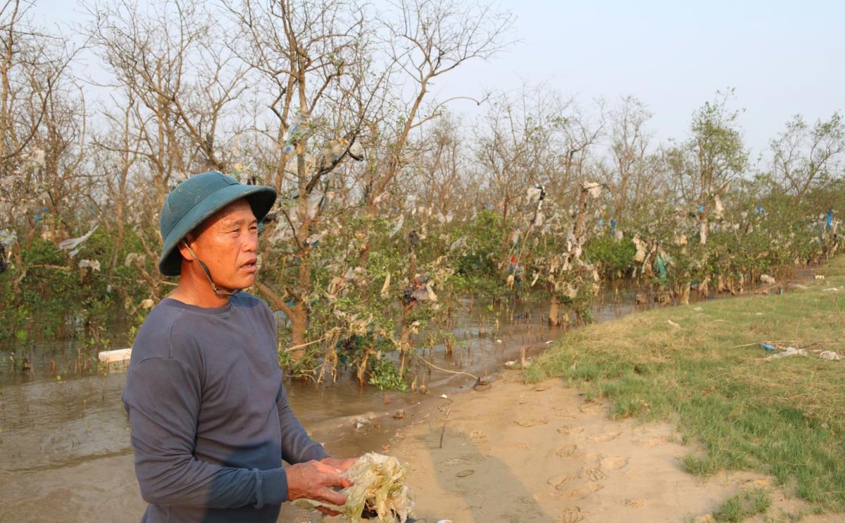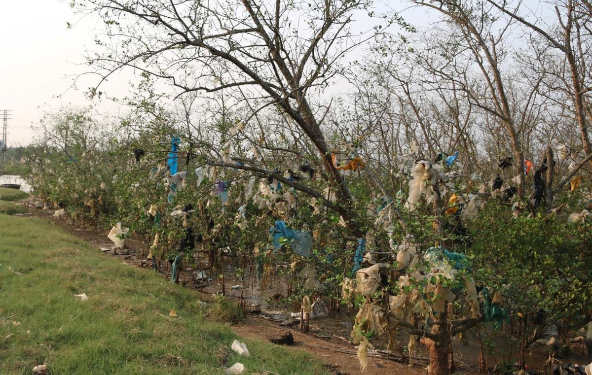 Cũng theo một số người dân sinh sống nơi đây, chính rác bủa vây quanh gốc cây, nguồn nước bị ô nhiễm và nhữngtúi ni-lôngbám chằng chịt trên cành là nguyên nhân khiến lá bần không thể phát triển, cây còi cọc, chết dần, chết mòn...