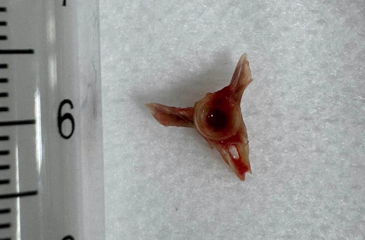 Sau khi tiếp nhận và thực hiện các xét nghiệm cận lâm sàng, các bác sĩ khoa Nội Hô hấp - Miễn dịch dị ứng đã chỉ định nội soi phế quản ống mềm dưới gây mê. Kết quả cho thấy dị vật là một đốt xương cá có ba cạnh sắc, kích thước 1,4 x 1,5cm, nằm ở phế quản trung gian giữa thùy giữa và thùy dưới phổi phải. Dị vật sau đó được lấy ra an toàn, kiểm tra không ghi nhận đàm mủ hay tổn thương thứ phát. Sau thủ thuật, người bệnh tỉnh táo, triệu chứng ho và đau ngực giảm rõ rệt, phổi thông khí tốt, đang hồi phục ổn định.