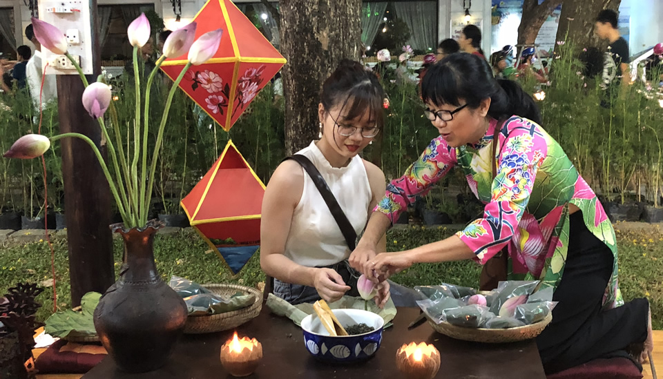 Du khách được hướng dẫn và tự tay ướp trà sen. |