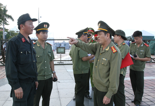 Đại tá Lê Văn Tam, Phó Giám đốc CATP Đà Nẵng kiểm tra công tác bảo vệ của lực lượng Cảnh sát Cơ động tại khu vực bắn pháo hoa. |