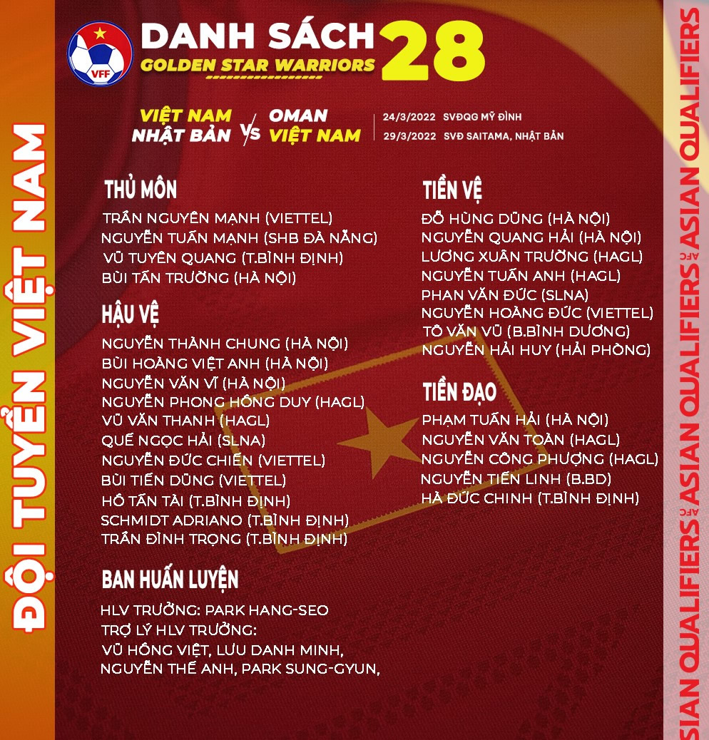 Danh sách 28 cầu thủ được triệu tập lên đội tuyển Việt Nam. |