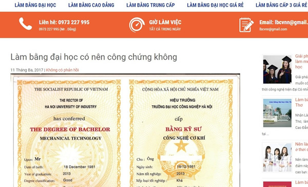 Bằng đại học giả giá 4 triệu đồng, bằng cao đẳng, trung cấp, bằng nghề, chứng chỉ ngoại ngữ… có giá từ vài trăm ngàn đồng đến vài triệu đồng. Muốn là loại gì cũng có đó là những lời rao nhan nhản trên các trang mạng Internet, mạng xã hội… Từ thông tin trên trang mạng “Lambangdaihoc…com”, chúng tôi liên hệ với số điện thoại 0973.227.99x. Đầu dây bên kia là giọng một người đàn ông tự giới thiệu tên Dũng. Sau khi nghe nhu cầu về làm một tấm bằng đại học thuộc hệ văn bằng 2, chuyên ngành kinh tế để bổ sung vào hồ sơ cán bộ thì Dũng báo giá luôn “cái đó bên anh làm 4 triệu nhé”. “Không giảm giá được hả anh?”. “Không em, đó là giá chung toàn quốc rồi. Anh đảm bảo với em, bằng bên anh làm bằng thật 100%, từ phôi bằng cho đến bảng điểm. Tiền nào của nấy em à”. Theo thông tin từ người đàn ông này, nếu đồng ý làm bằng tại Đà Nẵng thì gửi các thông tin về: họ tên, ngày sinh, nơi sinh, giới tính, tên trường, tên ngành, mã số sinh viên và mã số lớp (nếu có), hệ chính quy hay liên thông, bậc đào tạo, xếp loại, năm tốt nghiệp. Đồng thời gửi thêm số điện thoại, tên người nhận bằng và địa chỉ để nhân viên chuyển phát nhanh giao tận tay, xem bằng xong rồi mới trả tiền nhận bằng. Tôi bảo rằng giá 4 triệu đồng là quá cao thì phía bên kia nhấn mạnh rằng “Thích thì làm chứ không ép khách. Tiền nào của nấy”.