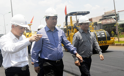| Bộ trưởng Bộ GTVT Đinh La Thăng kiểm tra tiến độ thi công đường Hồ Chí Minh qua Tây Nguyên. |