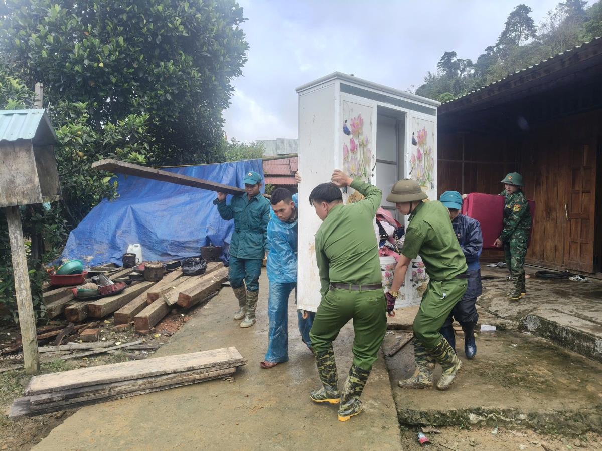Công an xã Hùng Sơn giúp người dân tháo dỡ, di chuyển tài sản khỏi khu vực nguy hiểm.