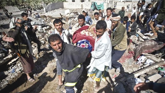 Người dân mang thi thể một nạn nhân thiệt mạng ra khỏi ngôi nhà bị sập trong chiến dịch không kích của Saudi Arabia ở Yemen hôm 26-3. Ảnh: AP |
