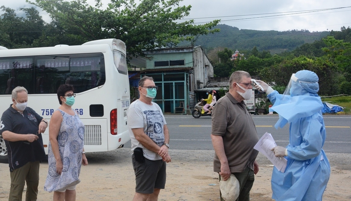 Xe chở khách du lịch được kiểm tra y tế tại TP Đà Nẵng. |