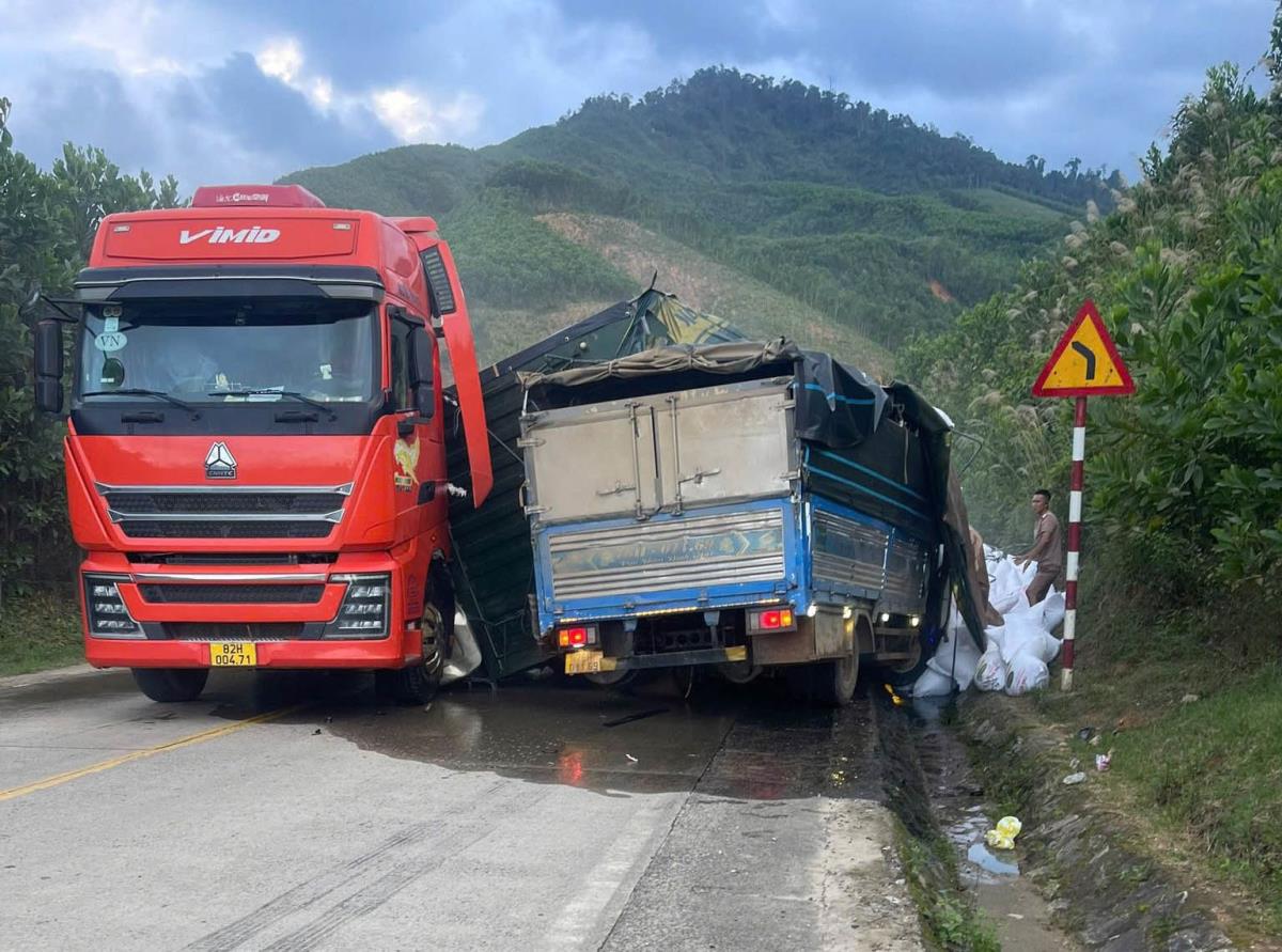 Theo đó, lúc 16 giờ 20 ngày 8-11, tài xế Nguyễn Văn Lộc (1991, trú xã Đắk Tô, tỉnh Quảng Ngãi) điều khiển xe đầu kéo BKS 82H-004.71 kéo rơ-moóc BKS 82R-002.52 lưu thông đến đoạn Km1386+250 đường Hồ Chí Minh) đã va chạm với xe ô-tô tải BKS 76H-011.69 do tài xế Võ Thanh D. (1989, trú xã Thăng An, Đà Nẵng) điều khiển, chạy hướng ngược lại.