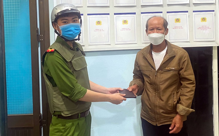 Trong quá trình làm nhiệm vụ vào khuya 24-1, Tổ tuần tra 8394 phường Nam Dương (quận Hải Châu, Đà Nẵng) nhặt được chiếc ví có hơn 5,5 triệu đồng cùng nhiều giấy tờ tùy thân. Ngay trong đêm, Công an phường Nam Dương đã xác minh và trả lại chiếc ví cho ông Dương Thanh Phong (1955, trú H. Mộ Đức, Quảng Ngãi). Nhận lại tài sản bị rơi, ông Phong rất vui mừng và đã viết thư cảm ơn CBCS Công an phường Nam Dương và Tổ tuần tra 8394.