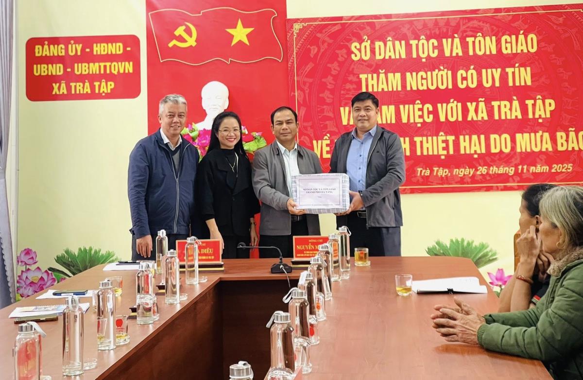 Trước đó sáng cùng ngày, đoàn công tác cũng đã đến thăm hỏi, động viên và trao hỗ trợ cho các hộ dân bị thiệt hại nặng do mưa bão trên địa bàn xã Trà Linh và xã Trà Tập. Tại những nơi đến thăm hỏi, làm việc, Giám đốc Sở Dân tộc và Tôn giáo cùng đoàn công tác đã chia sẻ, động viên bà con cố gắng vượt qua giai đoạn khó khăn, sớm ổn định đời sống và sản xuất. Đoàn công tác cũng đã trao quà hỗ trợ cho địa phương và các hộ dân bị ảnh hưởng nặng bởi mưa bão.