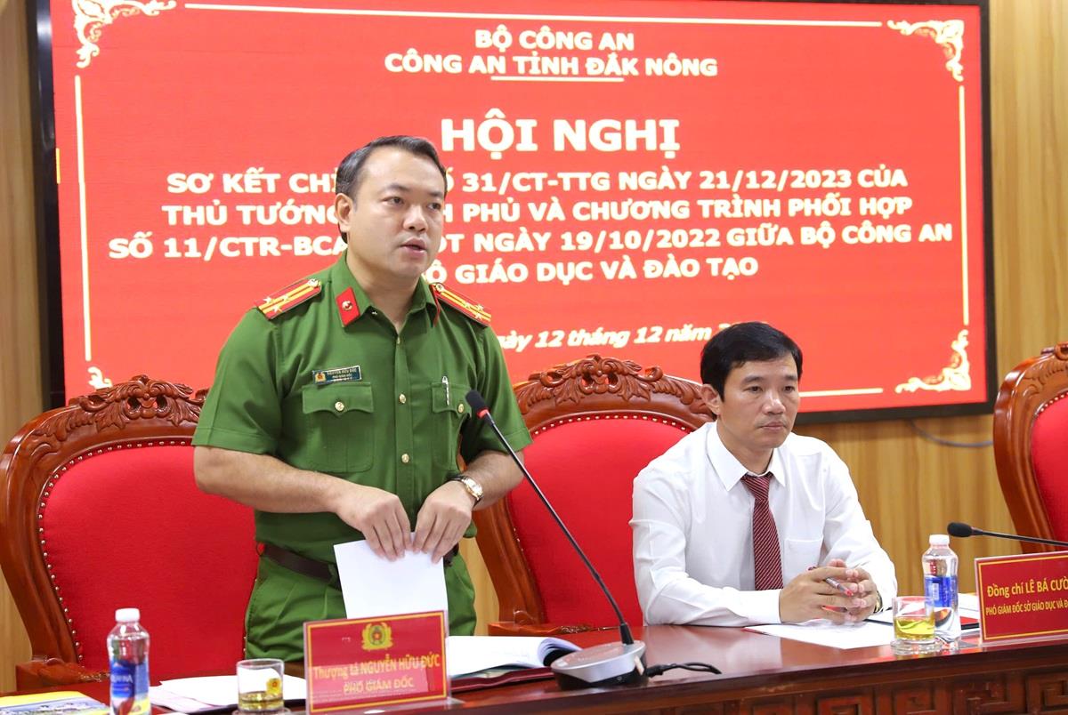 Chiều ngày 12/12, Công an tỉnh Đắk Nông phối hợp với Sở Giáo dục và Đào tạo (GD-ĐT) tỉnh tổ chức hội nghị sơ kết Chỉ thị 31/CT-TTg ngày 21/12/2023 của Thủ tướng Chính phủ về công tác bảo đảm trật tự, an toàn giao thông (TTATGT) cho lứa tuổi học sinh trong tinh hình hình mới (gọi tắt là Chỉ thị 31) và Chương trình số 11/CTrPH-BCA- BGDĐT ngày 19/10/2022 của Bộ Công an và Bộ GD-ĐT về tăng cường công tác tuyên truyền, phổ biến, giáo dục pháp luật về trật tự, an toàn giao thông trong các cơ sở giáo dục giai đoạn 2022-2025 (gọi tắt là Chương trình số 11).