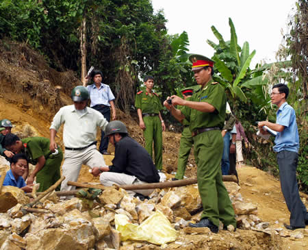 Ngược dốc chừng 1km nữa, chúng tôi gặp đoàn kiểm tra của xã Hòa Ninh, gồm ông Huỳnh Tân - Chủ tịch UBND xã, anh Phạm Đức Thắng - Trưởng CAX cùng lực lượng CA viên và cả cán bộ kiểm lâm H. Hòa Vang cũng vừa ở nơi khai thác đá quay ra. Ông Huỳnh Tân, phân trần: “Kỳ thực thì UBND xã cũng đã phát hiện việc một số người dân ở Hòa Sơn lên khu vực Suối Mơ đào đá về bán nên phân công CA, Xã đội và các ban, ngành lên kiểm tra, nhằm chấn chỉnh tình hình. Không ngờ lại có thông tin đây là đá quý, có giá đến 100USD/kg, rồi hàng trăm người dân đổ về khai thác...”.