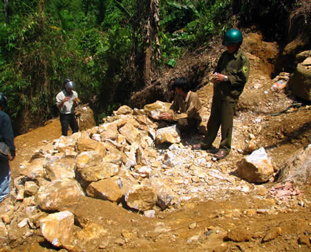 Cùng ông Phạm Đức Thắng - Trưởng CAX, chúng tôi đi theo con đường mòn vào “mỏ” đá. Gọi là mỏ, nhưng thực chất chỉ là một hố đá rộng chừng hơn 10m, những người đi đào đá mới đào, cạy gần 10 ngày qua. Anh Nguyễn Ân (nhà ở thôn An Ngãi Tây, Hòa Sơn, Hòa Vang) - một trong những người đầu tiên phát hiện ra “mỏ”, cho biết, “mỏ” được phát hiện cách đây một tuần, lúc đầu chỉ có hơn 10 anh em trong thôn lên đào, cách đây 2 hôm, nghe đào đá về bán được tiền, trong khu vực Hòa Sơn có khoảng gần 20 người nữa lên theo đào lấy đá.