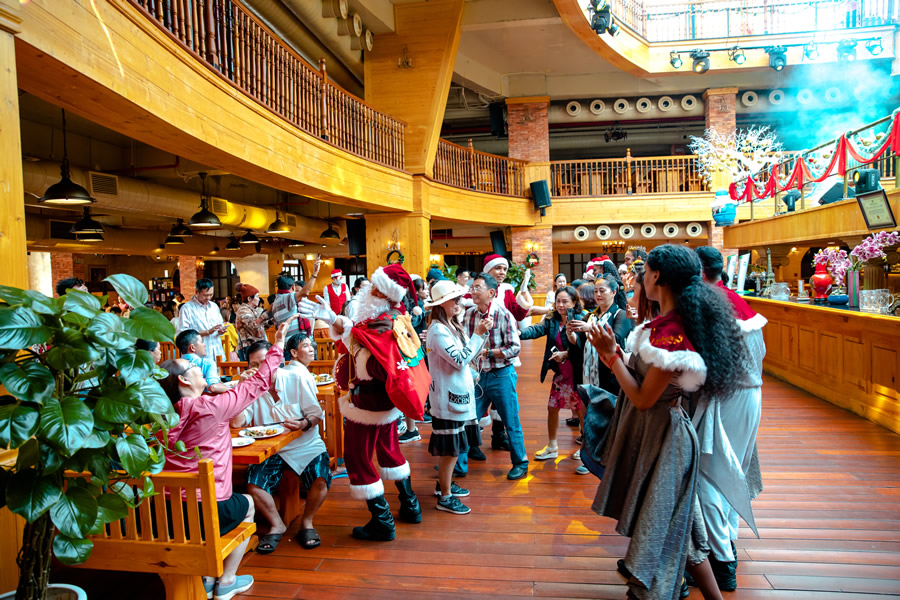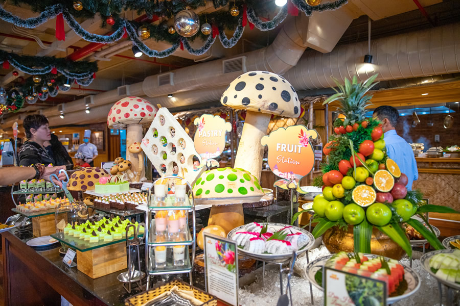 Đừng bỏ lỡ ẩm thực đậm chất Giáng sinh chỉ có một lần trong năm tại nhà hàng Beer Plaza. Với bữa tiệc buffet mùa lễ hội hàng trăm món ăn chuẩn vị và được tạo hình, bày biện bắt mắt trong dáng hình những hộp kẹo, hộp đồ chơi, cây nấm… du khách sẽ vừa "đã bụng" vừa mãn nhãn. Thậm chí, nhiều du khách còn mải mê chụp hình tại các quầy buffet ở Bà Nà đến… quên cả đi ngắm Cầu Vàng.