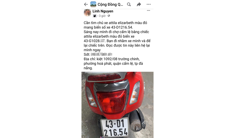 Trưa 16-1, tài khoản Facebook “Linh Nguyen” đăng thông báo, trong lúc đi mua sắm tại chợ Cẩm Lệ (Đà Nẵng), chị này có gửi xe máy Attila Elizabeth màu đỏ, BKS 43G1-028.xx tại bãi giữ xe. Tuy nhiên, khi xong việc quay lại thì không thấy xe đâu, chỉ thấy một chiếc xe khác giống như xe mình mang BKS 43D1-216.54. Đợi vài tiếng đồng hồ song không thấy ai nhận xe nên nghi ngờ là có người nhầm lẫn giữa 2 chiếc nên lấy nhầm. Ngoài sự thiếu trách nhiệm của chủ bãi giữ xe khi không kiểm tra kỹ thông tin trên phiếu giữ xe thì cộng đồng mạng còn cho rằng, nguyên nhân lấy nhầm xe một phần vì ổ khóa xe đã bị hư, chìa nào cắm vào cũng được.
