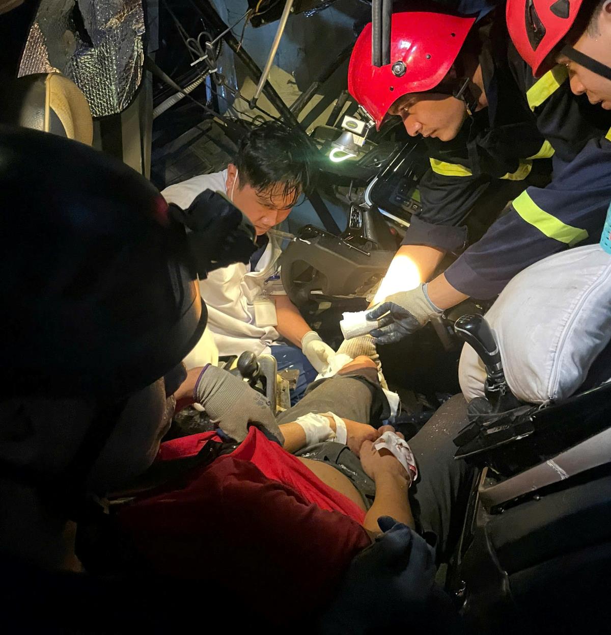 Riêng tài xế xe khách bị kẹt cứng trong cabin. Đến 22h10 cùng ngày, sau gần 2 giờ nỗ lực, lực lượng Cảnh sát PCCC và CNCH đã giải cứu thành công, bàn giao cho lực lượng y tế tiếp tục chăm sóc.