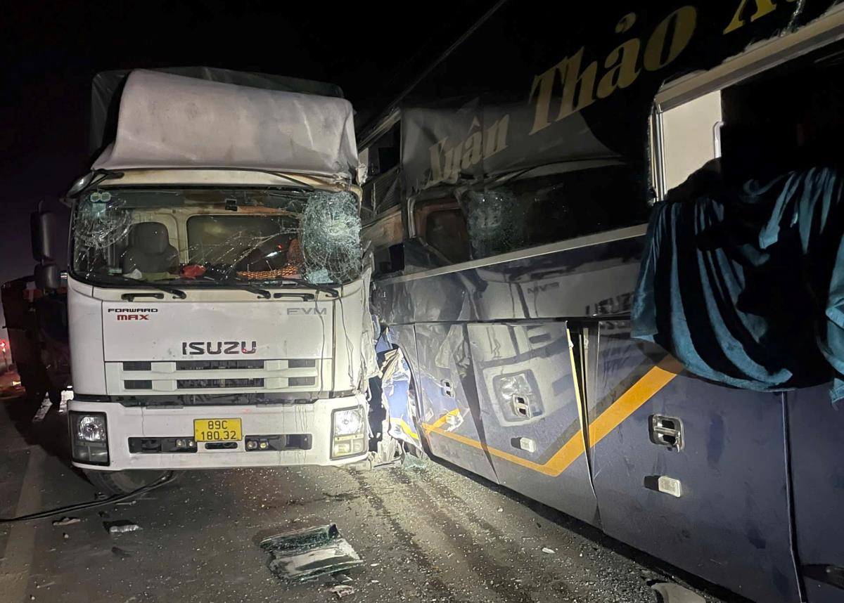 Cú va chạm mạnh khiến xe khách và xe tải 89C-18032 mắc kẹt, nhiều hành khách bị thương, mắc kẹt bên trong, tài xế xe khách bị mắc kẹt trong cabin biến dạng.