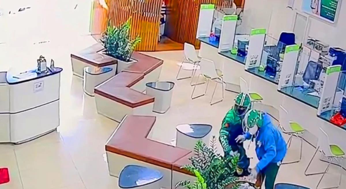 Các đối tượng mặc áo khoác của hãng Grab, đội mũ bảo hiểm màu xanh Grab, nghi sử dụng xe mô tô nhãn hiệu Exciter, sơn màu vàng – đen, gắn BKS 77G1-31312 và mang theo một túi xách màu xanh (dạng ba lô con cóc) dừng xe trước cửa Phòng Giao dịch Trà Bá.