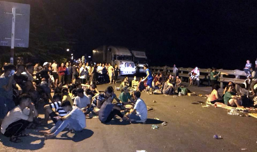 Nhiều người kéo ra giữa Quốc lộ 1 đoạn qua xã Phổ Thạnh chặn xe gây ách tắc giao thông nhiều giờ.