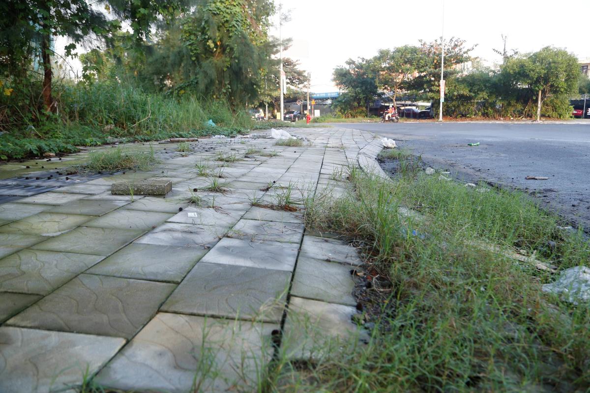 Gạch đổi màu, bám rêu và cỏ mọc um tùm trên vỉa hè dù mới thi công xong chưa lâu.