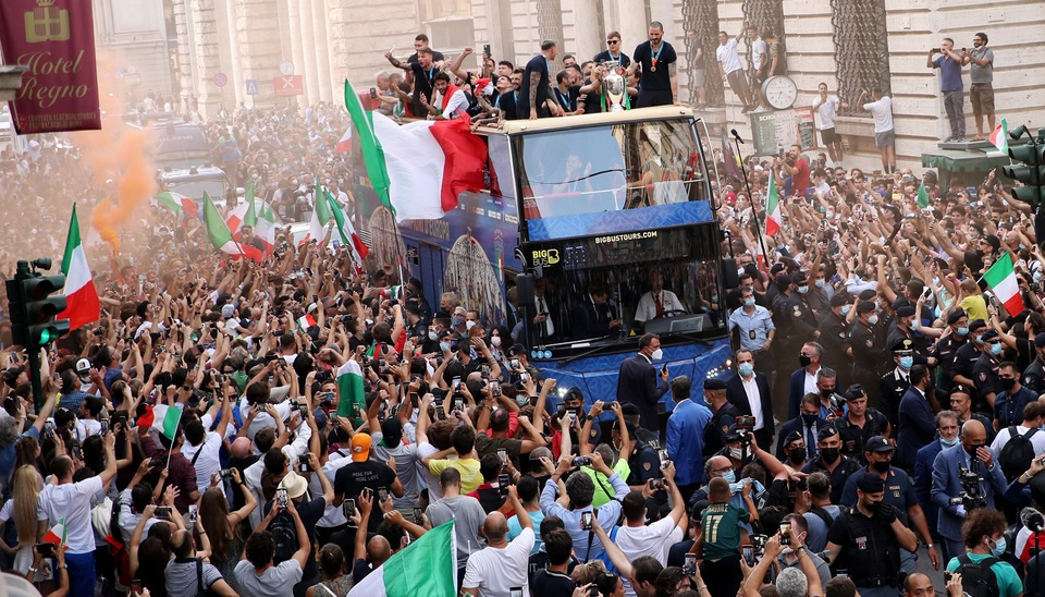 Sau buổi gặp mặt với các chính trị gia, lễ ăn mừng của tuyển Italy cùng người hâm mộ chính thức bắt đầu vào rạng sáng 13-7 (giờ Hà Nội). Hàng nghìn người hâm mộ chờ sẵn trên các con phố để đón những người hùng trở về sau chiến công vô địch Euro 2020 trên đất Anh. Italy đã 4 lần vô địch thế giới, nhưng họ phải chờ đợi từ năm 1968 đến nay mới giành thêm chức vô địch châu Âu thứ 2.