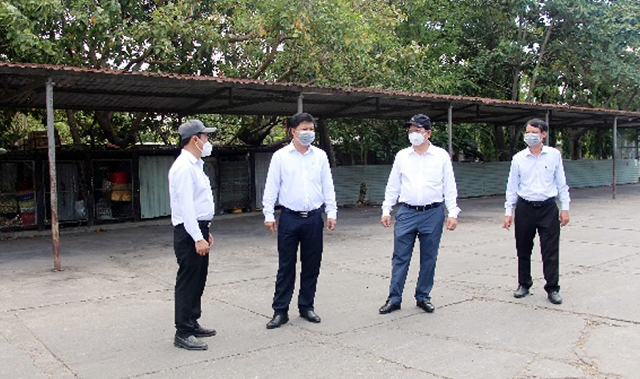 Phó Bí thư Thường trực Thành ủy, Chủ tịch HĐND thành phố Lương Nguyễn Minh Triết (thứ 2 từ trái sang) kiểm tra thực tế tại Trung tâm giết mổ gia súc, gia cầm Đà Sơn. |