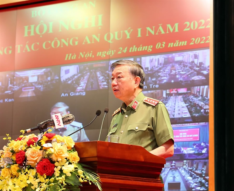Phát biểu tại Hội nghị, Bộ trưởng Tô Lâm ghi nhận, biểu dương và chúc mừng những thành tích, chiến công mà lực lượng Công an nhân dân đã đạt được trong thời gian qua. Về nhiệm vụ công tác trọng tâm quý II-2022, Bộ trưởng Tô Lâm yêu cầu, Công an các đơn vị, địa phương chủ động triển khai thực hiện các kế hoạch của Bộ, tập trung các mệnh lệnh công tác, gắn trách nhiệm của thủ trưởng Công an các đơn vị địa phương vào triển khai các chỉ đạo của Bộ. Đẩy nhanh tiến độ điều tra các vụ án thuộc diện Ban Chỉ đạo Trung ương về phòng, chống tham nhũng tiêu cực theo dõi, chỉ đạo; tăng cường đấu tranh với các loại tội phạm lợi dụng dịch bệnh, các chính sách phục hồi kinh tế - xã hội và bối cảnh xuất nhập khẩu, sản xuất kinh doanh khó khăn để hoạt động đầu cơ, tạo khan hiếm các loại hàng hóa nhằm đẩy giá cả lên cao để trục lợi; nắm chắc tình hình thị trường bất động sản, ngăn chặn các vi phạm, không để hình thành “bong bóng” bất động sản.