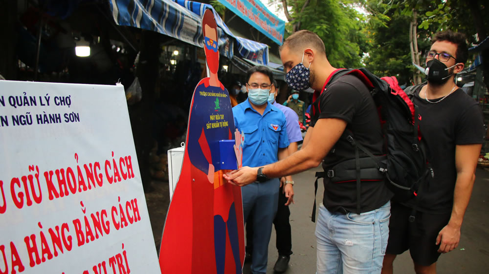 Du khách nước ngoài rửa tay sát khuẩn trước khi vào chợ. |