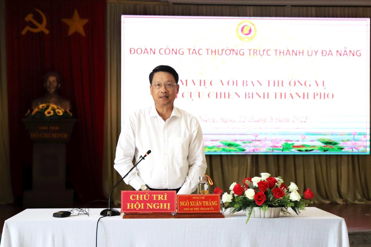 Ngày 13-8, Phó Bí thư Thành ủy Ngô Xuân Thắng chủ trì buổi làm việc với Ban Thường vụ Hội Cựu chiến binh thành phố Đà Nẵng. Cùng dự có Chủ tịch Ủy ban MTTQ Việt Nam thành phố Lê Trí Thanh và Phó Chủ tịch HĐND thành phố Nguyễn Công Thanh.