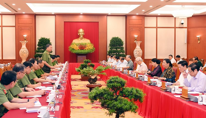 Phát biểu kết luận cuộc làm việc, Tổng Bí thư, Chủ tịch nước Nguyễn Phú Trọng nhất trí với các ý kiến đánh giá sâu sắc, đóng góp tâm huyết của các đồng chí Ủy viên Bộ Chính trị; đồng thời nhấn mạnh ba vấn đề Đảng bộ Công an cần chú trọng trong quá trình lãnh đạo, chỉ đạo nhiệm kỳ tới.