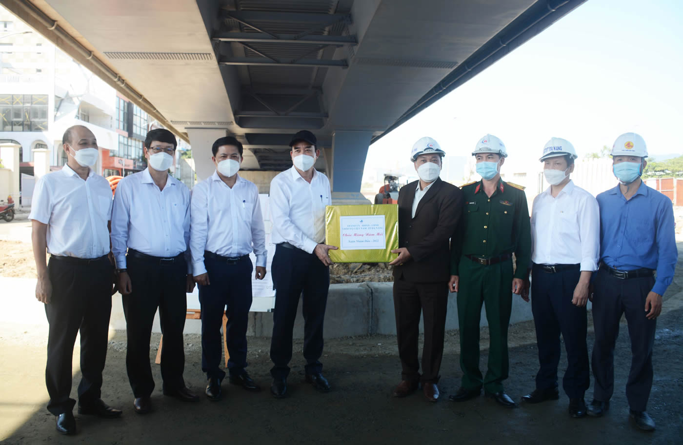 Lãnh đạo TP tặng quà tết cho các đơn vị thi công cải tạo Cụm nút giao thông phía Tây cầu Trần Thị Lý. |