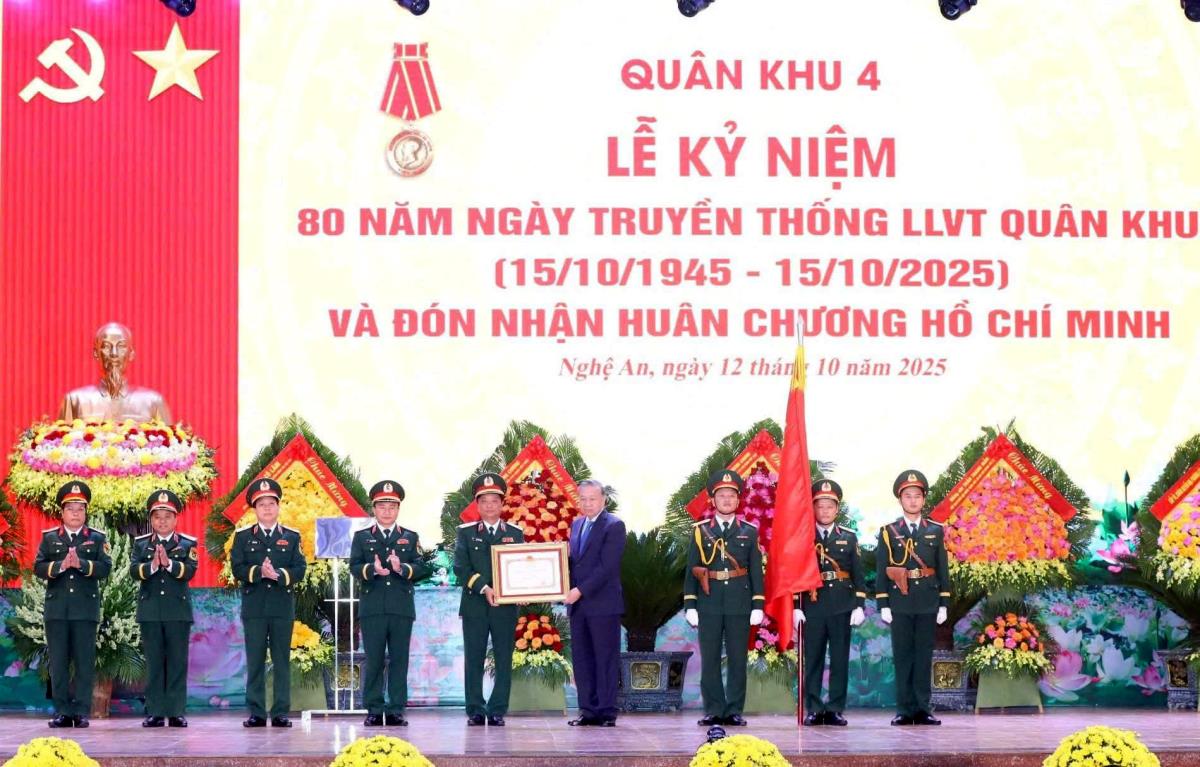 Ngày 12-10, Đảng ủy, Bộ Tư lệnh Quân khu 4, Bộ Quốc phòng tổ chức trọng thể Lễ kỷ niệm 80 năm Ngày truyền thống LLVT Quân khu 4 (15/10/1945 - 15/10/2025) và đón nhận Huân chương Hồ Chí Minh. Tổng Bí thư Tô Lâm dự và phát biểu chỉ đạo. Dự Lễ kỷ niệm còn có lãnh đạo các ban, bộ, ngành Trung ương.