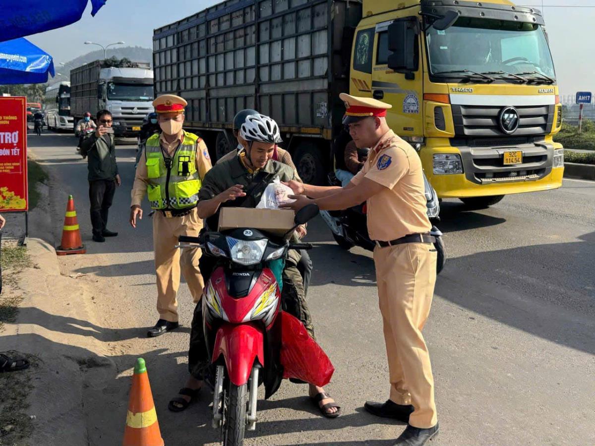 Trên những con đường tấp nập người xe, bóng dáng những chiến sĩ Cảnh sát giao thông Công an TP Đà Nẵng vẫn miệt mài hướng dẫn, điều tiết giao thông, đảm bảo không để xảy ra ùn tắc, tai nạn. Tại Trạm Cảnh sát giao thông cửa ô Hòa Nhơn, các cán bộ chiến sĩ tổ chức chương trình "Tiếp sức người dân về quê ăn Tết". Hàng trăm phần bánh mì, nước uống, khăn ướt được trao tận tay các bác tài, người dân trong hành trình về quê. Không chỉ vậy, lực lượng còn tận tình tuyên truyền những quy định của Luật Giao thông đường bộ và nhắc nhở các lưu ý quan trọng để đảm bảo an toàn cho mọi người trên mỗi chặng đường. Dẫu giá trị những món quà không lớn, nhưng sự quan tâm, sẻ chia của các chiến sĩ Cảnh sát giao thông đã tiếp thêm động lực, giúp những hành khách xa quê thêm vững tin để vượt qua đoạn đường dài, kịp trở về bên gia đình trong mùa Tết đoàn viên.