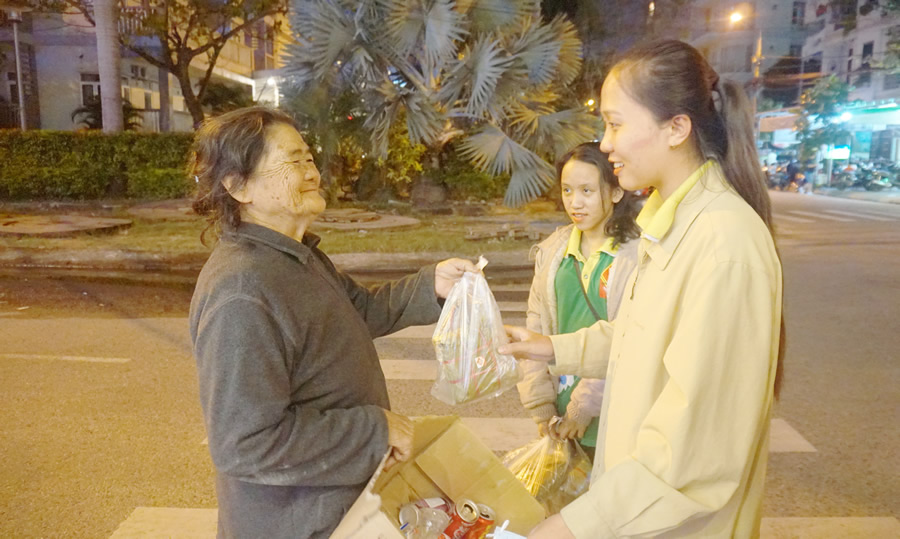 Sinh viên tặng bánh chưng cho một bà cụ nhặt ve chai. |