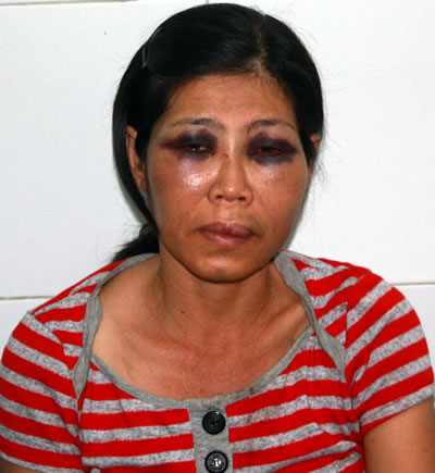 Chị Thảo bị đánh thâm tím mặt. |